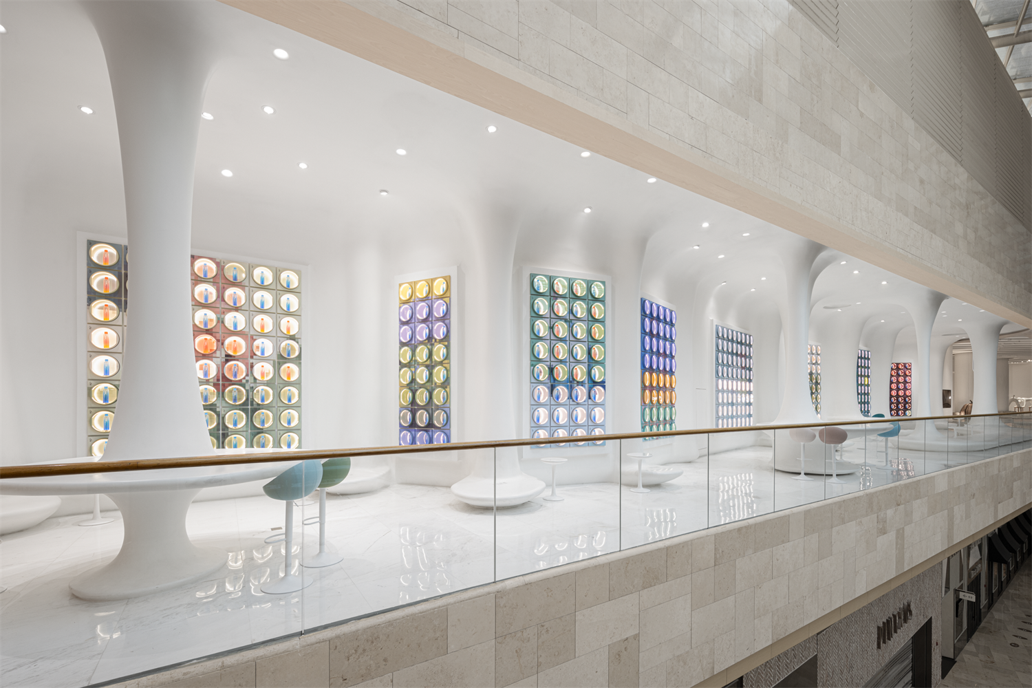 白墻上,一個個色彩漸變的取貨柜猶如拼圖塊,拼插為一幅幅方形畫作,難以取物的高處格口巧妙地作為隱蔽回風口,或是單純陳列的窗口。色彩被分割,再以分離的筆觸織綴成畫。后退幾碼,漸變的色塊突然各得其所,凝結為閃爍生命力的花,畫作的印象方透過朦朧的肌理同光一起折射而來。團團的色彩如花朵在心底暈染,寂靜里綻開一個無限光輝的春天。