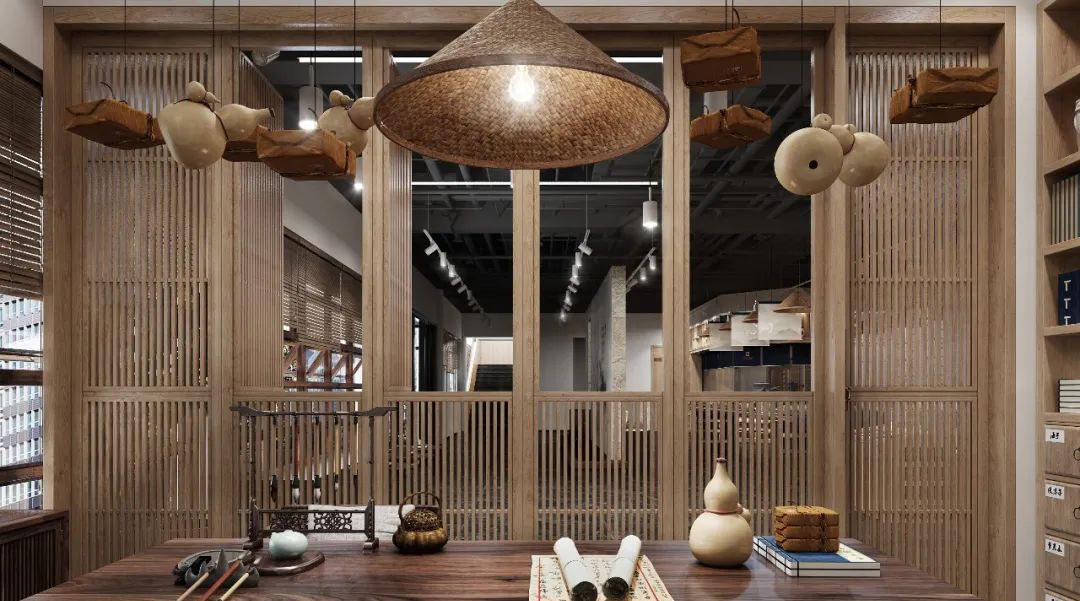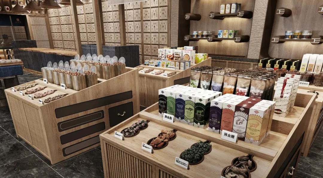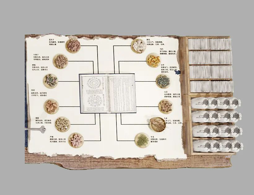 明清素工的案臺上方,懸掛著藥方和葫蘆,以及斗笠形狀的吊燈,每一處都體現著“諸藥以草為本”。