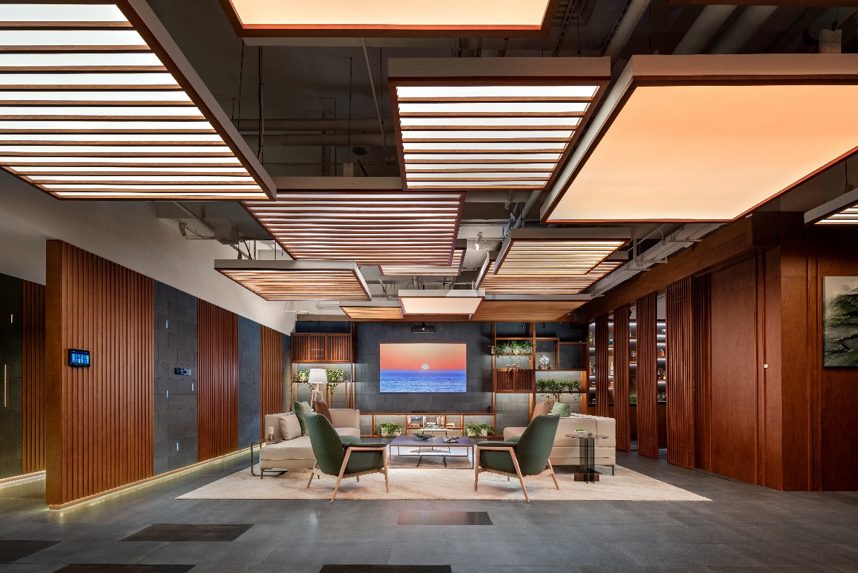 來自中國澳洲設計團隊原墨設計(YOMO Studio)的設計總監Merling Xie在綠米科技Aqara VIP展廳設計中,也在屋頂做了獨特的處理,運用高低錯落、層層疊加的藝術格柵燈片,在傳統的材料上,通過自身的理解融合新科技在室內空間當中。室內層高有限,頂部遍布著橫豎交織的管道,采用高低錯落的格柵燈設計,巧妙的解決了層高問題,又讓管道在空間中不突兀。以自然環保、傳統中創新、溫馨舒適為主題,創造了一個人文、自然、技術自洽的精神空間。