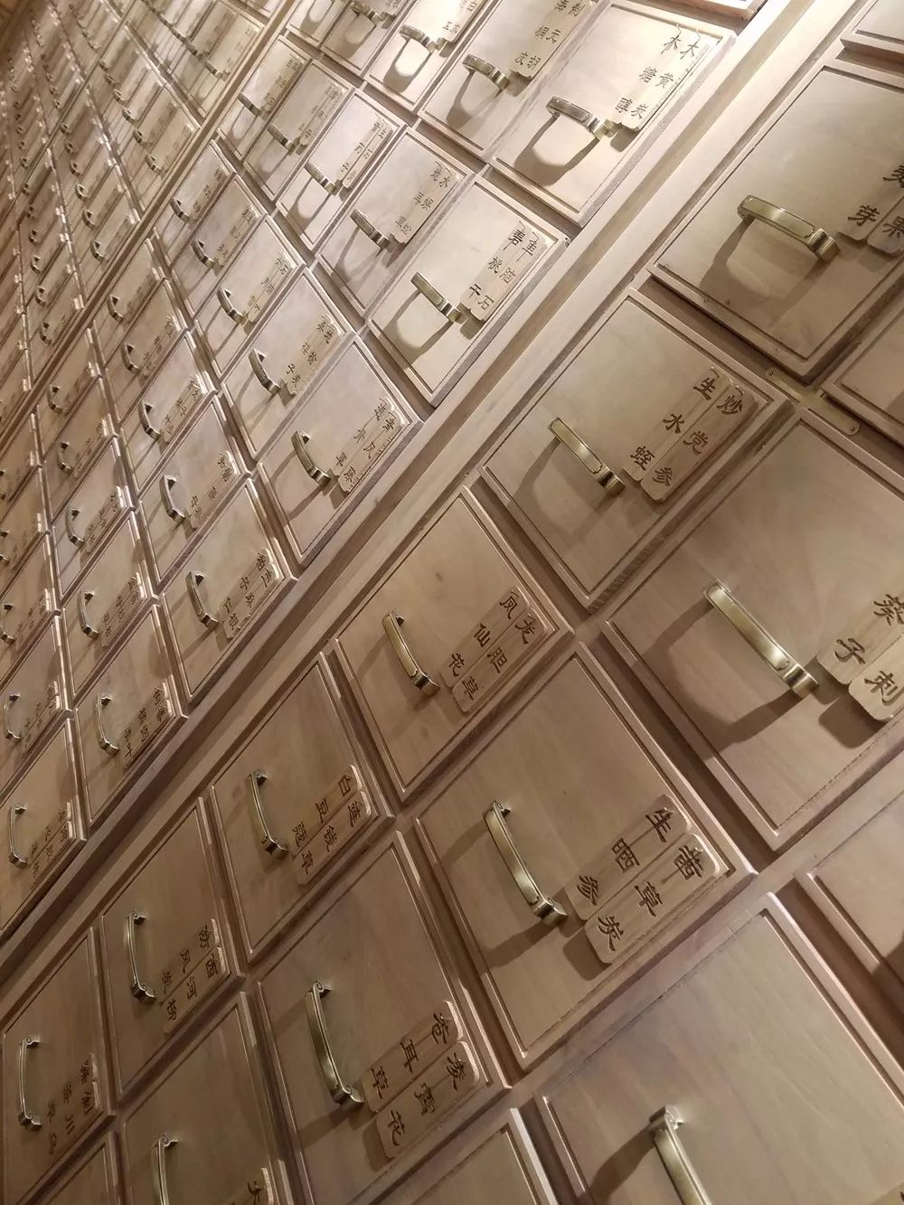 柜臺和存放藥材的百子柜,往往是一個醫館的核心,在本次設計中依然保留了傳統的醫館模式,貝聯珠貫的小抽屜呈現嚴謹的秩序感,在燈光下熠熠生輝。